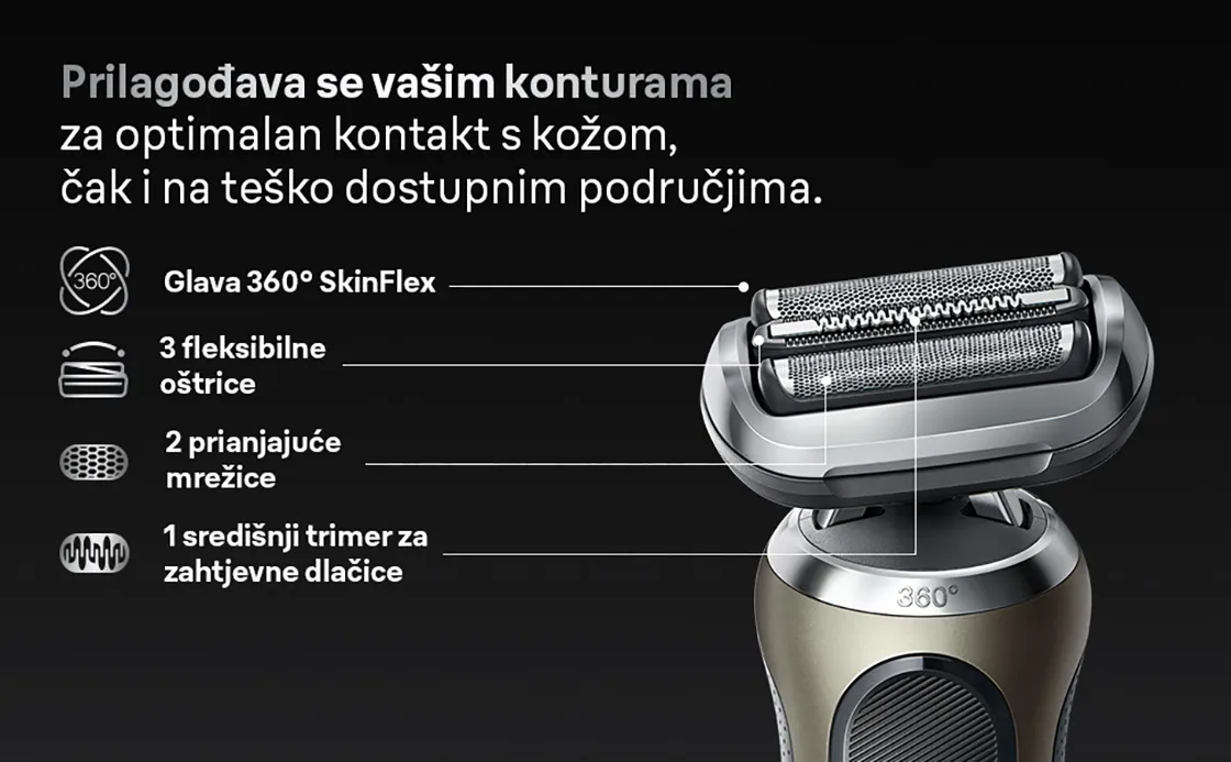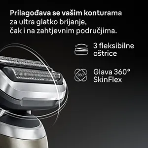 Glava 360° SkinFlex i 3 fleksibilne oštrice prilagođavaju se konturama vašeg lica za ultra glatko brijanje, čak i na zahtjevnim područjima