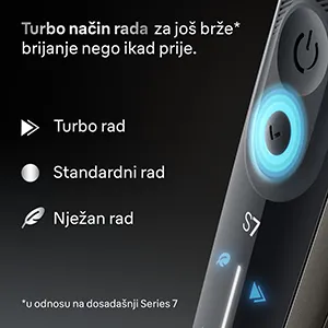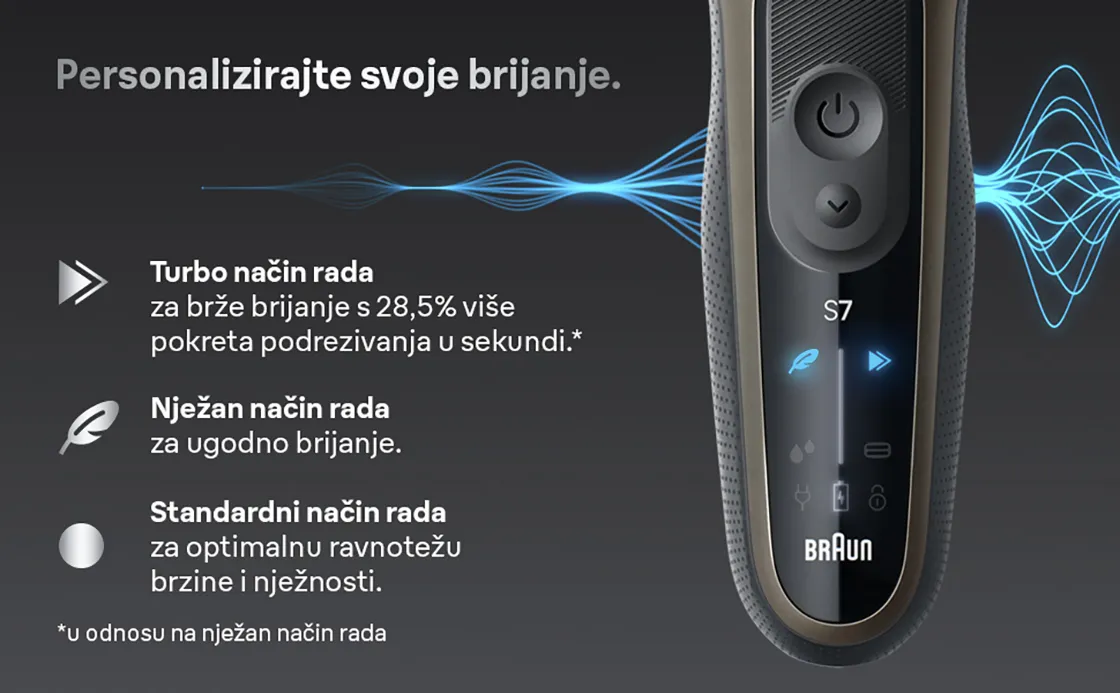 Braun Series 7 ima tri načina rada – turbo za brže* brijanje, nježni za izuzetno ugodno brijanje i standardni za optimalnu ravnotežu brzine i nježnosti