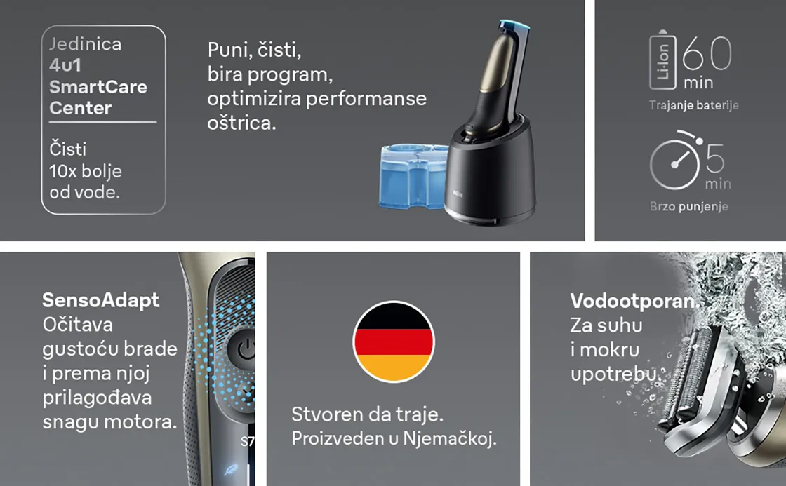Brijaći aparat za muškarce Braun Series 7 pruža temeljitije i brže brijanje nego ikad prije.* Glava 360° SkinFlex prilagođava se konturama vašeg lica za ultra glatko brijanje. Mogućnost izbora između tri načina rada – turbo, standardnog i nježnog – omogućuje personalizaciju brijanja prema vašim potrebama. Brijaći aparat je vodootporan te prikladan za mokru i suhu upotrebu. Dolazi s litij-ionskom baterijom za 60 minuta rada, a moguće je i 5-minutno brzo punjenje. U kompletu dobivate: 1 brijaći aparat za muškarce Series 7 u zlatnoj boji, 1 jedinicu SmartCare Center s 1 patronom za čišćenje, 1 nastavak s preciznim trimerom, 1 putni etui, 1 punjač i 1 četkicu za čišćenje.